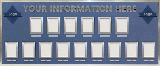 Position the frames as you like to fit the width of the board. You have a choice of frame and background colors. We will use your unique colors, logo, and icons to help you design the board and provide production proof for approval.
