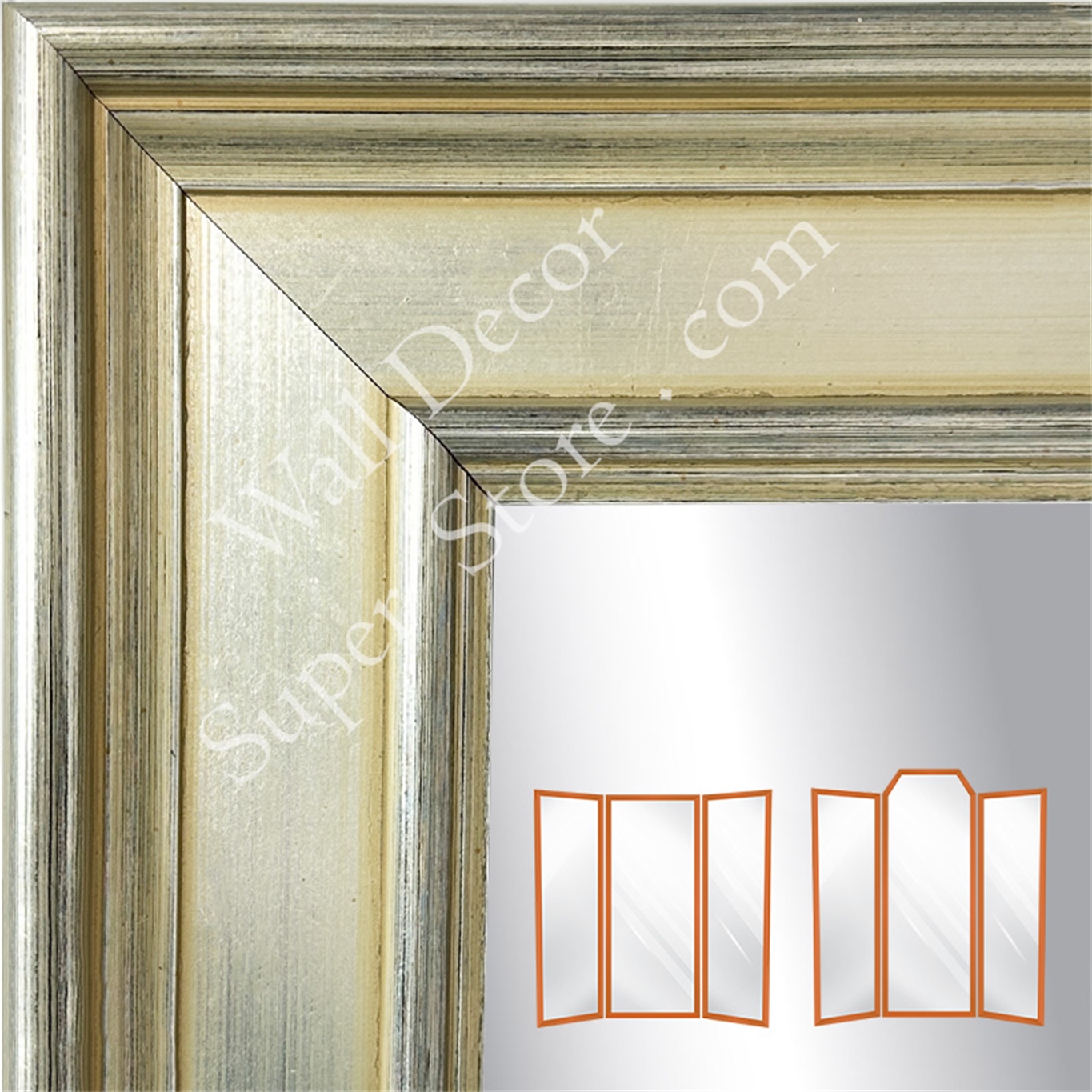 Create A Full 360 Degree View - Wardrobe Dressing Mirror Depth of Moulding:: 2 Inches Width of Frame Moulding :: 1 Inch WM1965 - Large Distressed Gold & Silver - Custom Three Panel Mirror Price: $2,799.99 SKUWM1800 Select Frame Color Size of 3 Panel Mirror Select Size Flat Top 24x30-78 | 24" Sides 30" Center | 78" High All Panels Flat Top 30x36-84 | 30" Sides 36" Center | 84" High All Panels (+$750.00) Flat Top 36x40-84 | 36" Sides 40" Center | 84" High All Panels (+$1,500.00) Flat Top 36x48-92 | 36" Sides 44" Center | 92" High All Panels (+$2,000.00) --------------- Raised Top 36x40-7284 | 30" Sides 40" Center | 6' H Sides 7' H Ctr (+$1,750.00) Raised Top 36x48-8496 | 30" Sides 40" Center | 7' H Sides 8' H Ctr (+$2,500.00) Add 1 Inch bevel to all three mirrors Select Optional Bevel No Bevel Bevel 15x20x60 (+$199.99) Bevel 16x22x72 (+$239.99) Bevel 18x24x72 (+$249.99) Bevel 24x24x72 (+$269.99) Bevel 24x24x78 (+$279.99) Bevel RT18x24x66-78 (+$279.29) Bevel RT24x24x72- 84 (+$299.99) Wall Mounted Or Floor Standing Select One - No Charge Floor Standing Wall Mounted Enter Comments(optional) - + Add to Cart Add to wishlist Email a friend Tweet