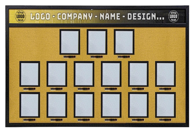The number and place of the photo frames can be optional. You have a choice of frame and background colors. We will use your unique colors, logo, and icons to help you design the board and provide production proof for approval.